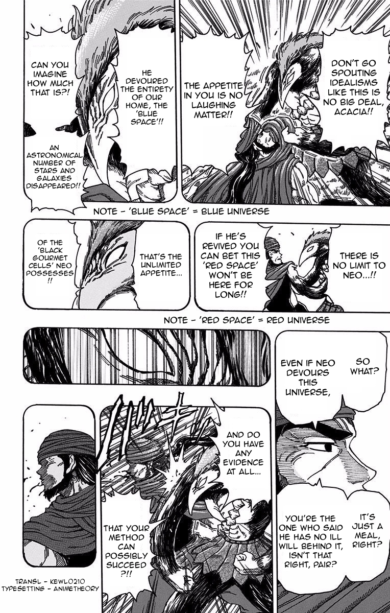 Durability: Unknown. Possibly Solar System level | Solar System level (Is able to take hits from Don Slime, took a hit from Toriko, also took dozens of hits from GOD after being hit through to the other side of the Earth) | Solar System level | Solar System level (Much more durable than before, was completely unscathed by Midora's Meteor Burst attack at close range that sent him into space, tanked Midora's Hungry Space attack and was even able to advance towards him while the attack was still going), possibly higher. While his physical body can be destroyed, his soul will remain and inhabit a new host body from which it can re-coalesce its physical form [This, however, takes long periods of time]. Regeneration also makes it hard to kill, as NEO has revived from supernova explosions in the past; and Neo's (Currently Acacia's as of now) ability to consume any attack directed towards him makes Acacia even more difficult to kill. | At least Solar System level, possibly higher (More durable than before)