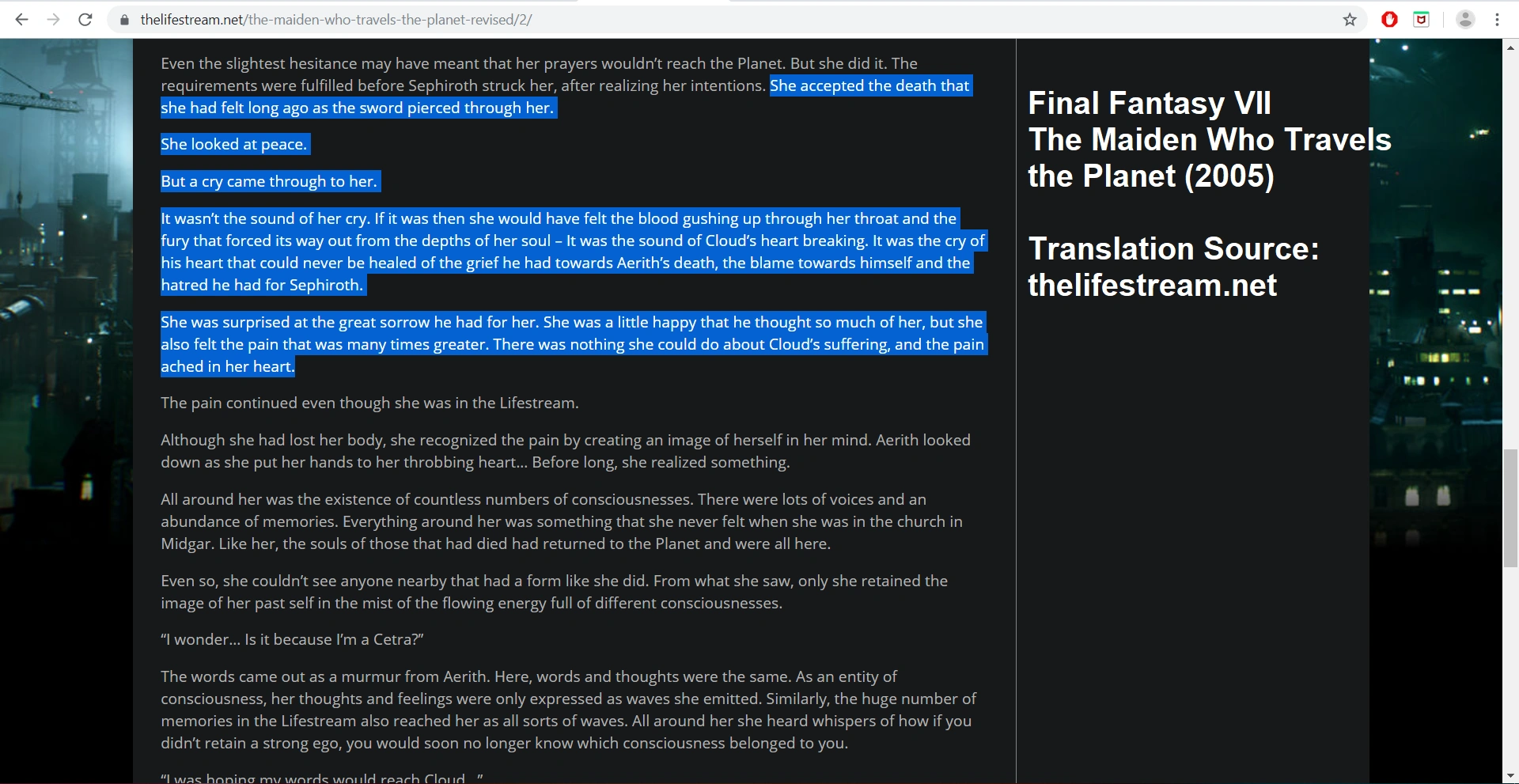 - ↑ 13.0 13.1 Final Fantasy VII: The Maiden Who Travels the Planet (2005)