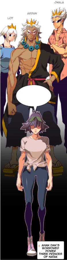 Powers and Abilities: Superhuman Physical Characteristics, Regeneration (Mid-Low), Borrowed Power (Type 1), Martial Arts, Fear Manipulation (Can exude a presence that fills others with fear and dread), Ice Manipulation, Weapon Creation, Earth Manipulation, Magma Manipulation, and Fire Manipulation (Should have all the same powers as the Princes of Natak), Resistance to Fear Manipulation, Ice Manipulation (Froze her own face with no negative repercussions), Fire Manipulation (Has no problem being close to lava)