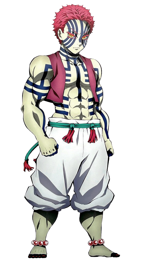 Akaza (猗窩座 Akaza) is a major antagonist of Demon Slayer: Kimetsu No Yaiba. He is a demon affiliated with the Twelve Kizuki, holding the third highest position, Upper Rank 3 (上弦の参 Jōgen no San). As a Kizuki, Akaza is one of the closest servants of the King of Demons, Muzan Kibutsuji, whose main purpose is to find the Blue Spider Lily so that Muzan can gain immunity from the sun.