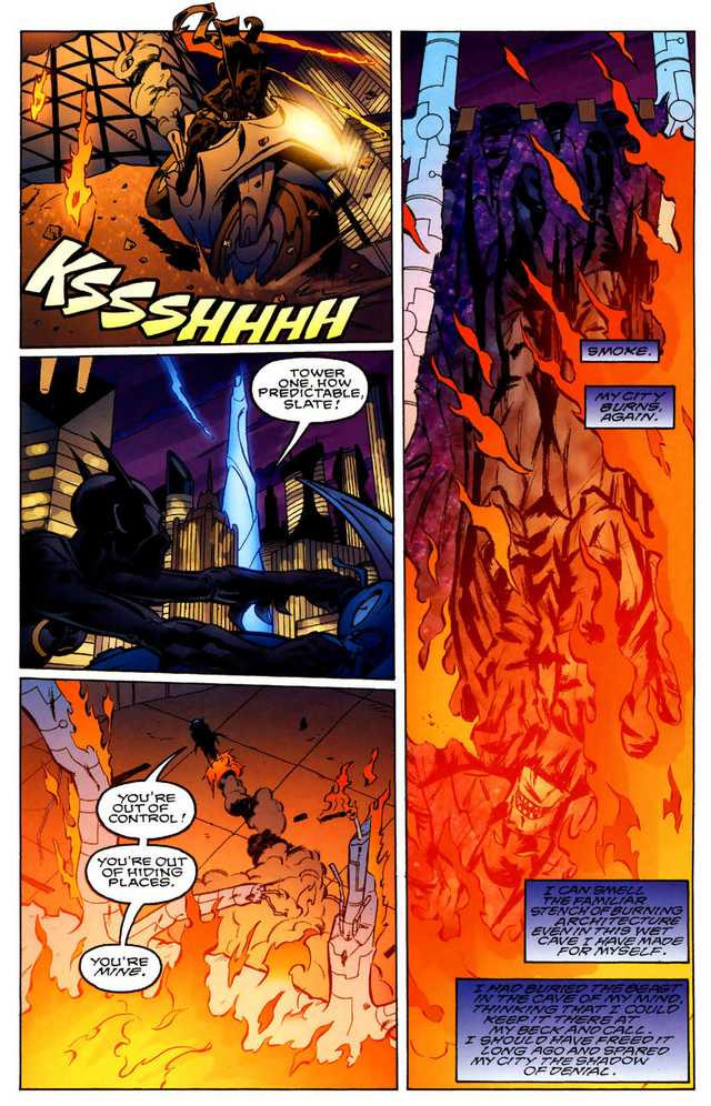 | “ | And as the sun, that had been too afraid to show its face in this city, started to turn the black into grey, I smiled. Not out of happiness. But because I knew... that one day, I wouldn't have to do this anymore. One day, I could stop fighting. Because one day... I would win. One day, there will be no pain, no loss, no crime. Because of me, because I fight. For you. One day, I will win. | „ |