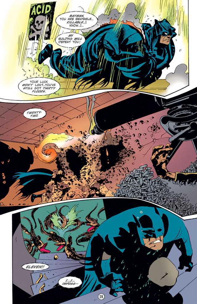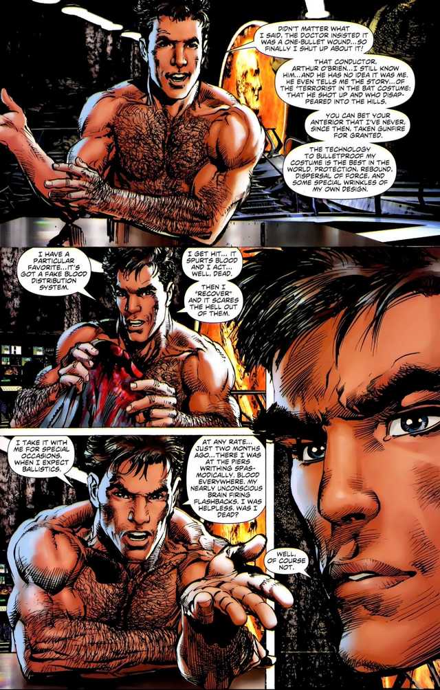 Lifting Strength: At least Class 1 (Can easily bench-press 1,000 lbs as part of his daily workout routine), possibly Class 5 (Has stated to be able to press 2,500 lbs with his legs. Can easily rip chains apart. Has repeatedly lifted off massive amounts of rubble off of him, and can pull massive steel beams with his grapnel gun. Pushed back a gigantic boulder and a marble statue. Stopped a gigantic metal penny from rolling. Pulled gigantic crates filled with explosives. Held up a massive portion of a collapsing building all by himself. Held up a large portion of a roof with his bare hands)
