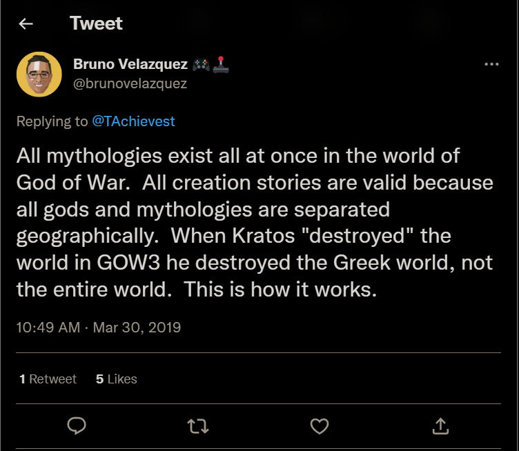As of May 9, 2020, it appears that we finally have direct, no-skirting-around director confirmation of this cosmological model, as per the following exchange that took place with Cory Barlog[8]: