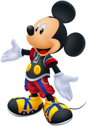 Mickey Mouse, formally referred to as The King, Your Majesty, or King Mickey, is the king of Disney Castle and a recurring character in the Kingdom Hearts series. He travels the worlds battling the forces of darkness and is a Keyblade Master, and the chosen Keyblade wielder for the Realm of Darkness, though he follows the path of light. Originally believing that the darkness had to be eliminated, he eventually realized that light and darkness are interdependent and cannot exist without the other due to his encounters with Riku.