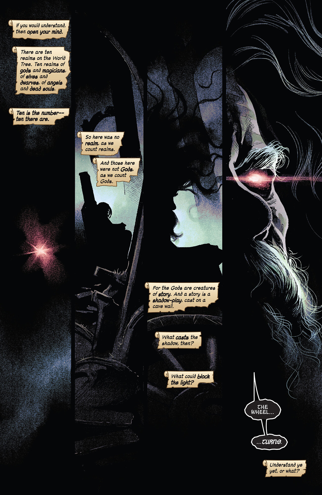 This connection between magic and stories even extends to the very gods of Marvel themselves,[61] as they themselves are creatures of story that aren't "real" like physical beings are.[62] In fact, Gods in their true forms are even stated to be entirely abstract in nature, and are "stories", stories which can only be interacted with and affected by other Gods of a similar cosmic standing,[63] or by being affected on the symbolic level.[64] As mentioned above, the Gods themselves are stated to be stories so good that they became magic, and those stories proceeded to echo through space and time back to the start of all things, mixing with the All-That-Was and sparking something new, such as the mythical Gods of the Marvel Universe as well as the 10 Norse Realms (each of which is its own universe), becoming so big and mad and brilliant that they go back in time and change other stories.[56] Also, Doctor Doom tells Loki that magic is essentially a higher narrative into the flow of events, imposing a narrative upon reality, imposing a story, a fiction into reality and willing it to become true. To be a God is to be a creature of magic, which is to be a creature of story.[59] The Elder Gods themselves were created by the Demiurge Primordial as literal aspects[65] through a mystical birth.[66] Amora the Enchantress even states that the nature of Gods as stories leaves them vulnerable to the story-based nature of raw and pure magic.[67] Words are ideas cast down from the platonic firmament, and the stories created from those words turn into things that last for eternity. Magic is also described as an ethereal concept that relies on faith and conviction. The magical essence of something is also stated to be the same as the very idea of it,[68] and the beings known as the Faltines, described as abstract in nature, are entirely made of magic. Dormammu himself, a being described as a literal concept, is made from a combination of the magical Flames of the Faltine as well as the mystical energies of the Dark Dimension, further establishing the conceptual nature of magic.