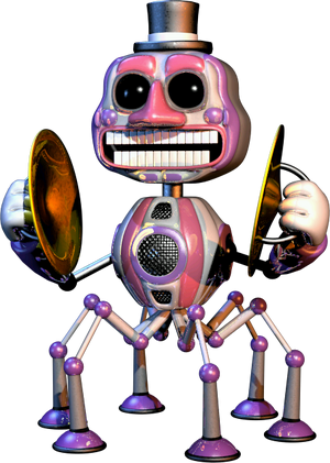 Powers and Abilities: Superhuman Physical Characteristics, Stealth Mastery (Can remain unseen by the player despite clashing his cymbals and being close enough to jumpscare them at a moment's notice[1]), Immortality (Types 1, 2 and 8; Characters frequently talk of torturing the player for eternity.[1] Comparable to Foxy who can literally tear himself limb from limb with no ill effects.[1] Can be brought back by The One You Shouldn't Have Killed after being erased by the Death Coin[1]), Self-Sustenance (Types 1, 2, and 3; As a robot, Music Man lacks a need for air, food, water, or sleep), Enhanced Senses (Can see in the dark), Inorganic Physiology (Type 2; Created by The One You Shouldn't Have Killed to torture William Afton), Sound Manipulation (With his cymbals), Berserk Mode (Attacks the player if there is too much noise[1]), Additional Limbs (Has six legs and two arms), Resistance to Temperature Manipulation (Is unaffected by the Heater, which can cause animatronics to glitch out and malfunction[1])