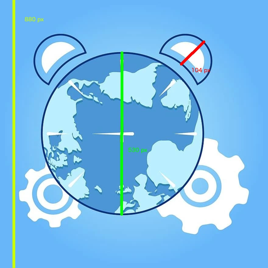 In this example the 880-pixel long yellow line is the panel height, the 104-pixel long red line is the size of the object we wish to measure (in this case the size of that ear the earth has) and the 530-pixel long green line is the diameter of the planet in pixel. As we are scaling earth the planet diameter in this example would be 12 742km.
