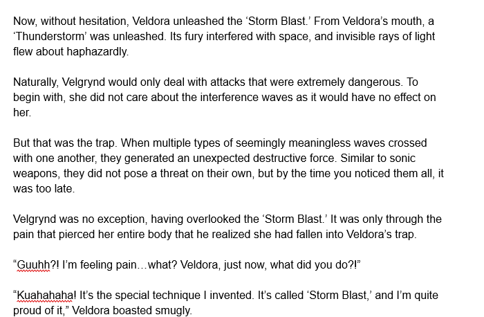 | “ | If he were indeed the fifth True Dragon, he could be considered a younger brother. However, Rimuru ate Veldora and evolved into a True Dragon. Velgrynd could not accept that such a being could be called a True Dragon. He was something similar to a True Dragon, so to speak. She could not and would not accept such a horrible existence. He needed to be exterminated here and now- | „ |