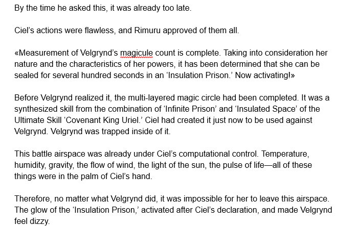 Velgrynd, Lord of Scorch: Rimuru had obtained this skill after analyzing and consuming the remains of Velgrynd's body inside of the Imaginary Space of Beelzebuth. It gives the following abilities: