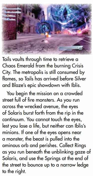 Solaris (ソラリス Sorarisu), the Sun God, is the final boss of Sonic the Hedgehog (2006). Originally a living flame, Solaris became unstable and was split into two halves during the Solaris Project; a research program at the behest of the Duke of Soleanna, who envisioned Solaris as enabling them to control the flow of time to fix past mistakes as the Flame of Hope. Mephiles the Dark was the malevolent and cunning mind of Solaris, while Iblis represented Solaris' raw power. Both of Solaris' halves were subsequently sealed away ten years prior to the events of Sonic the Hedgehog (2006).