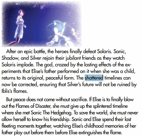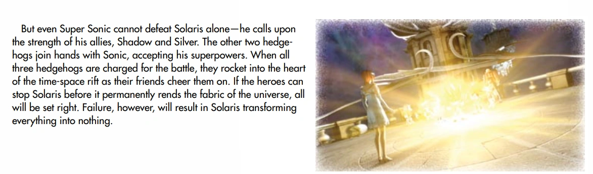 After being freed a decade later and hatching an elaborate plan, Mephiles was able to kill Sonic the Hedgehog and cause Princess Elise to cry; something that would cause the Iblis Trigger and allowing them to rejoin and recreate Solaris. Immediately upon fusing, Solaris sought to destroy time itself were it not for the combined efforts of Super Sonic, Super Shadow and Super Silver in their battle against it. Solaris was subsequently erased from existence by Princess Elise, ensuring his wrath would never be unleashed on the world.[1]