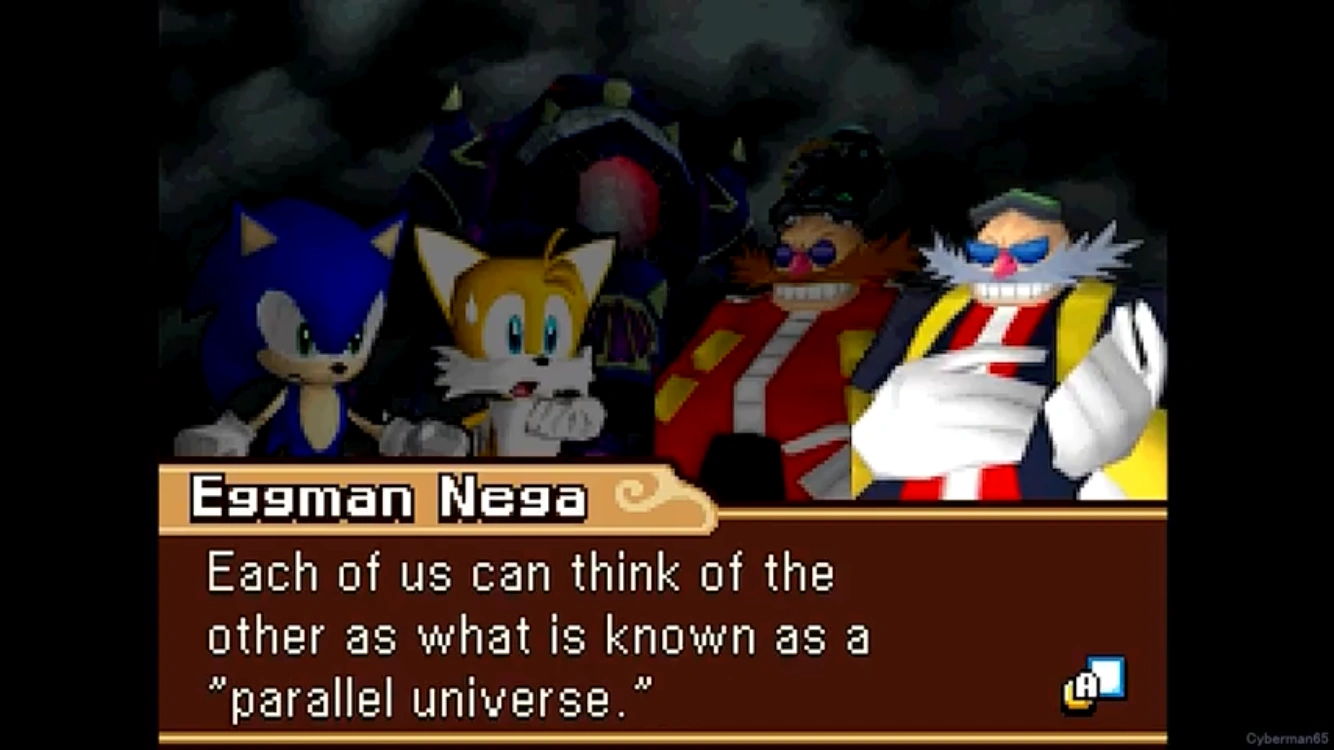 This is the Extra Zone of the final battle from Sonic Rush, directly stated to be the space between dimensions[156] and a collapsing dimensional rift.[156] This is where Dr. Eggman and Dr. Eggman Nega planned to create an Eggman Land of their dreams that surpasses all dimensions by using the power of the Chaos Emeralds and Sol Emeralds.[157]