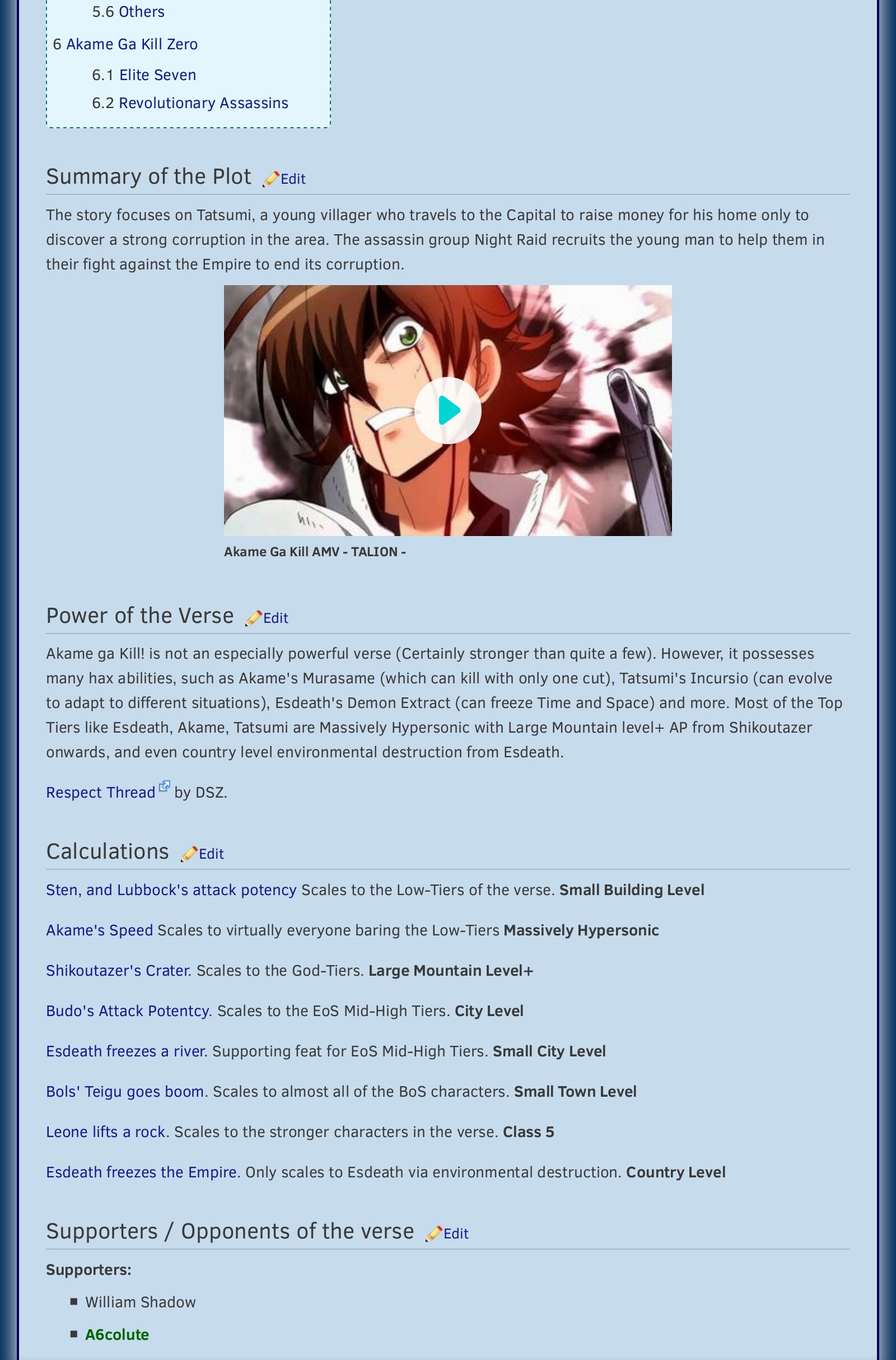 - It is very helpful if you place links to any currently used calculation blogs for the verse within this section, preferably with notes about which characters that they scale to, so visitors can more easily overview the basis for our statistics.