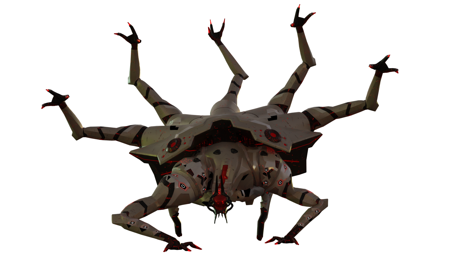 Standard Tactics: When possessed by The End, it will start the fight by summoning drones that fire a barrage of projectiles as it tries to swipe its opponent with its claws. It will counterattack with its drones if its attacks are parried, and will follow it up with a homing shot if not. It will activate its defense mechanism upon taking enough damage, creating angel wings and floating through the air while increasing its projectile spam. Once the fight goes long enough, it will pull its giant gun to target its enemy. | As The End's Avatar, Supreme will start by firing sets of five blasts at its opponent. It can also swipe its claws at its opponent, and if they fail to parry it, it will follow up by charging at them and attempting to crush them in its arms. If the gun in Supreme's back is removed, it will respond by firing a storm of blasts from its extra arms. Soon after, it will start flailing its extra arms wildly, and if this is not stopped, it will lunge at the opponent with them. After some time, it will turn around and fire a larger blast from its multiple arms that can cause devastating damage.