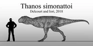 Thanos, full name being Thanos simonattoi, is the single dinosaur species contained in the genus of carnivorous Brachyrostran Abelisaurid theropods also named Thanos. This animal, obviously named after the Marvel Comics character of the same name, lived during the Santonian stage of the Late Cretaceous Period in what is now known as Brazil.