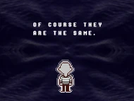 The Player Entity is an enigmatic creature that influences Frisk throughout Undertale. Due to seeing Undertale's world as a mere game and its characters as fictional, they seem to lack empathy for the characters and are willing to even kill all of them just to see a different ending. While their existence is rarely alluded to, there are some characters that seem to directly communicate with them at times. In Deltarune, The entity is actively acknowledged as a being who uses a vessel - Kris - to hold their SOUL. They control this SOUL, and through it the vessel, exploring the similar yet different world of Deltarune. At the end of chapter I, Kris removes the SOUL, seemingly becoming freed of The Player's control.