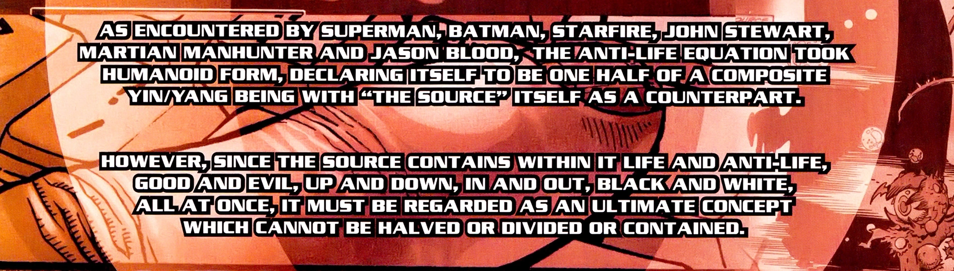 Powers and Abilities: Superhuman Physical Characteristics, Abstract Existence (Type 1; The Source and the Presence are the same entity), Conceptual Manipulation (Type 1; Gave rise to all the concepts and conceptual entities in the DC Universe), Paraconsistent Physiology (Type 1; Described as an "ultimate concept" that contains within it multiple dualities such as "life and anti-life, good and evil, up and down, in and out, black and white, all at once"[1]), Reality Warping, Nigh-Omniscience, Omnipresence, Incorporeality, Beyond-Dimensional Existence (Type 3)