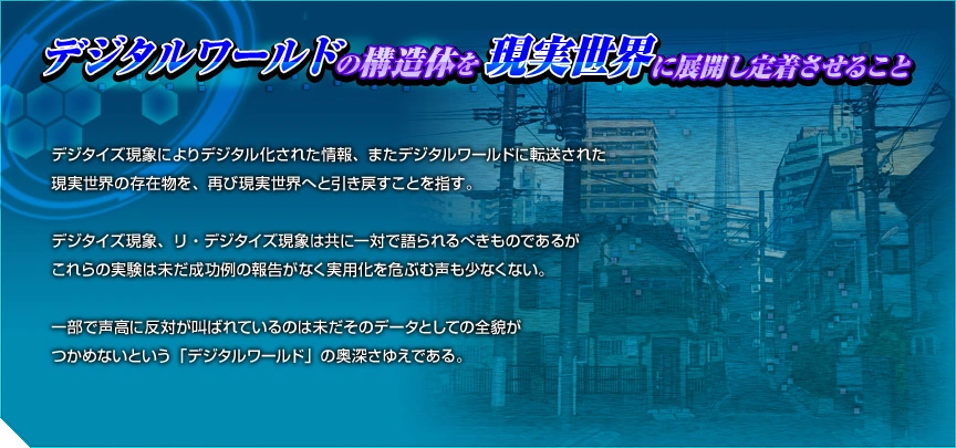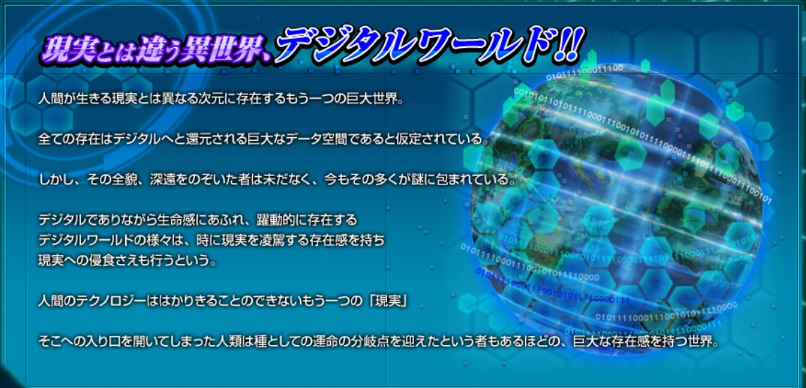 A huge world exists in a different dimension than the Reality in which human beings live. It is assumed that the all existence is reduced to data in this huge digital space. In any case, there has not been anyone who can see, profoundly, all the pieces, many of which are involved in mystery, of this existence. There are a variety of Digital Worlds that are full of life, though digital. They have an existence that transcends reality and sometimes even corrodes reality. Human technology has opened the door to another "Reality" that can not be measured and some people say that the human race has reached a turning point of destiny as a species. |
