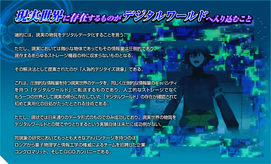Everything that exists in our world can be summarized in Digital World Data. The Digitizing process, called Digitize, is the process in which Substances from the Real World become Data that exists in the Digital World. Human beings when transformed into Data are recognized as Cyber Entity, a digital existence similar to the Digimon. Consequences of a Human turning into a Digital Existence include immortality (will never age), will no longer have physical needs (no more need to eat, sleep, etc.) and also physical limitations (like diseases) will cease to exist.
