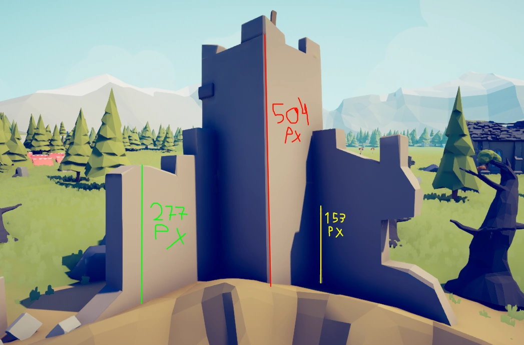 We don't need to calc the lenght of the castle since we alread found It when doing the hole, so the Castle block is a square with 6,38 meters on each side. Now for the castle height, we have It's towers height and It's walls height, I will only do the walls since the towers are mostly undamaged and the castle should have a averge height closer to the walls