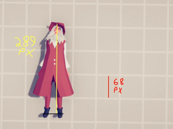 First of all we need to find a object with no size variation in the game that can be placed anywhere, so It's good for us that weapons in the game don't change size, i choosed the monk staff since It's a straight stick and can actually be placed vertically, for this I will be using something better then averge human height since wooblers aren't even human nor have gender, Leonardo da Vinci is in the game, so I took a bunch of his dead body to make sure It's not any of the variating sizes and putted It on the simulation map to get the size of the squares in pixels